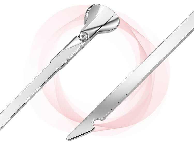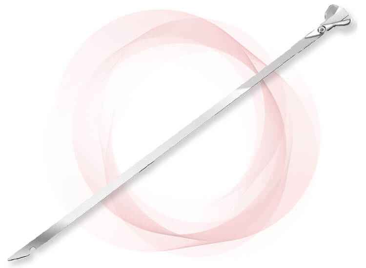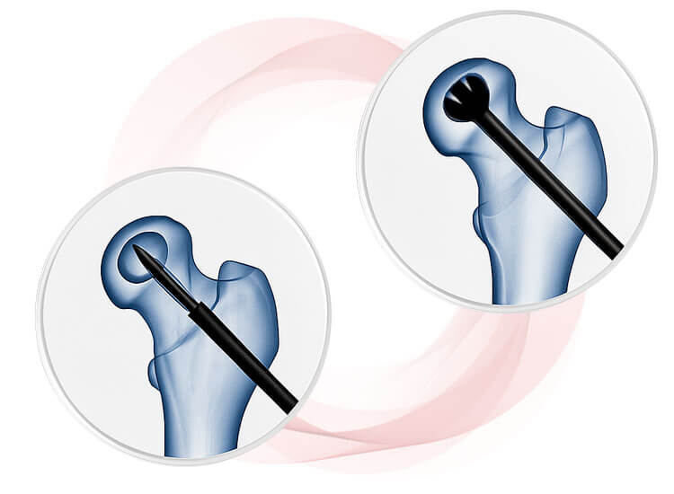 Lâmina Expansiva para debridamento de necrose de cabeça femoral (descompressão). O sistema permite o debridamento do tecido necrosado, paulatinamente através de sua abertura de até 2,5 cm, e preparando o local para aplicação de substituto ósseo através de seu instrumental adequado.